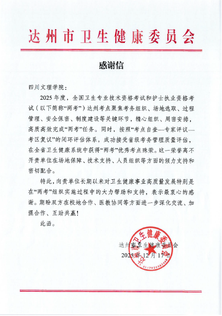 近日,达州市卫生健康委员会向我校发来感谢信,对学校在2025年度全国卫生专业技术资格考试和护士执业资格考试达州考点工作中的协作支持表示衷心感谢。此次由市卫健委承办的“两考”达州考点,成功获评全省“两考”优秀考点。