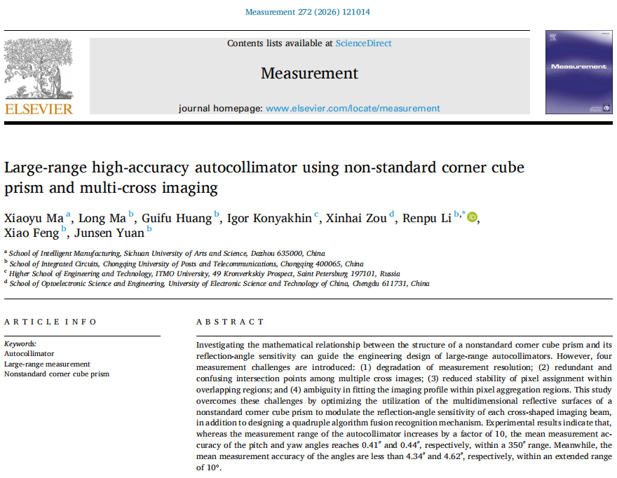 本次发表的论文题为“Large-range high-accuracy autocollimator using non-standard corner cube prism and multi-cross imaging”。团队聚焦高精度、大范围自准直仪研发这一行业核心课题,创新性采用非标准角锥棱镜搭配多十字成像技术,成功突破传统自准直仪测量范围与精度难以兼顾的技术瓶颈。该成果在精密仪器制造、航空航天检测、智能制造装备校准等高端领域具有广阔的工程应用前景,不仅填补了国内相关技术空白,也为全球光电精密检测技术发展提供了新的理论支撑。