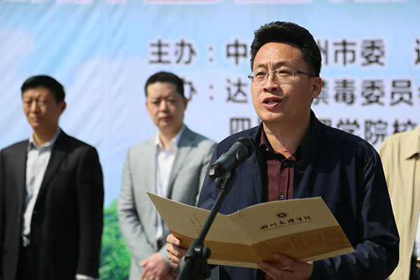 4月14日上午,达州市毒品预防教育师资培训基地揭牌暨首期培训开班仪式在莲湖校区隆重举行。市委常委、政法委书记、市禁毒委主任吴立岩,市委副秘书长、市禁毒委副主任牟道勇,市政府副秘书长、市禁毒委副主任谭政治,学校党委书记王洪辉,校长王成端,党委副书记、纪委书记雷超等出席仪式,市政府副市长、市禁毒委常务副主任王景弘主持仪式。