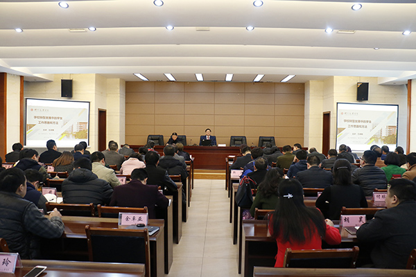 他强调,2017年是深入推进学校转型发展和迎接本科教学审核评估的关键之年,全体 学工人员要深入学习和贯彻《中共中央国务院关于加强和改进新形势下高校思想政治工作 的意见》,从三方面立德树人培养高素质应用型人才:一是坚持立德树人必须坚持学生主体地位;二是坚持学生主体地位必须做到以学生为中心;三是努力让学生成为“三心四能 五复合”的高素质应用型人才。