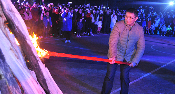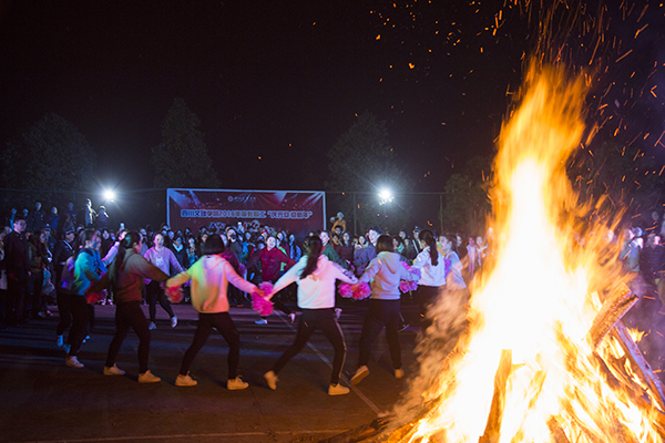 党委书记王洪辉点燃篝火,闪烁的火光驱散了夜幕,照亮了每一个人的笑脸,整个操场变成一片欢乐的海洋。