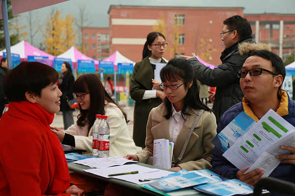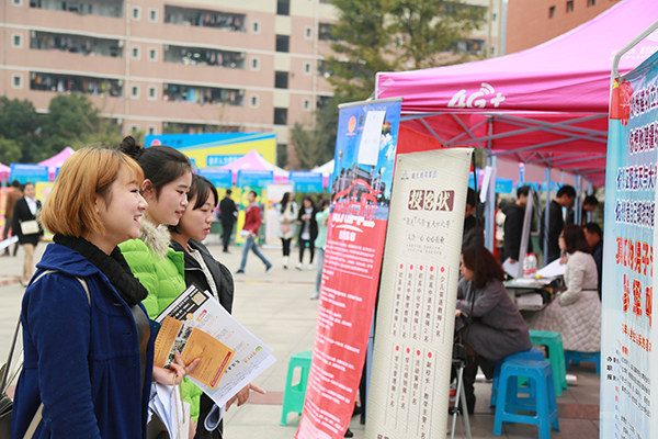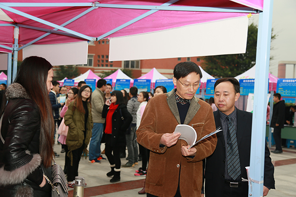 时逢严寒降温天气,双选会现场依旧热闹非凡,173家招聘单位沿着音乐广场一字摆开,人群熙熙攘攘,求职人员依次排队等候面试,场面秩序井然。据统计,我校2017届共有50个专业及专业方向的2834名学生即将毕业,参加本次双选会的人员多达三千余人,许多往届毕业生及社会待业人员也专程赶到我校参与现场招聘。为了保证毕业生能够找到满意工作,兼顾毕业生工作地域需求,学校特邀四川省内外众多知名企业、用人单位来我校招聘。本次参与招聘的单位性质较为多样,既有国有企业、民营企业,又有政府机关、事业单位、学校和培训机构。招聘单位涵盖了制造业、金融业、计算机服务与软件业、教育、医疗、保险等多个行业,招聘岗位涉及教育、工商、管理、机械、化工、建筑工程、营销、设计、金融、保险、商务等众多门类和领域,为毕业生提供了更多的选择机会,充分满足学生多样化需求。双选会现场,求职人员在各个展位上与用人单位认真沟通,仔细了解招聘岗位需求、薪资待遇等信息,并投放简历。不少同学经过深入洽谈已初步确定了就业意向,希望通过进一步的沟通加深了解,最终实现就业。