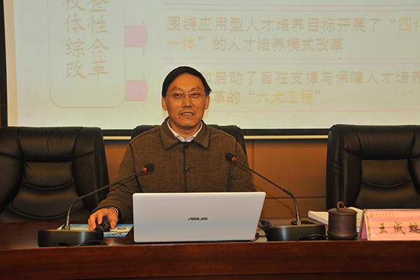 王成端校长引用习近平总书记讲话指出,当前地方高校在人才培养方面与社会期望存在“三个差距”,一是人才培养质量与经济社会发展的要求有差距;二是学科专业结构与产业转型升级的要求有差距;三是自主创新能力与区域创新体系建设的要求有差距。基于现实状况,地方新建本科院校,必须深入推进高等教育综合改革,以改革促进自身发展,以改革强化内涵建设,以改革提升学校核心竞争力。他强调,当前要根据现实要求,立足实际,以“四化一体”人才培养模式改革引领学校整体性综合改革的探索与实践。在具体实践中,学校作了五项部署安排:着眼于综合改革的顶层设计确立“建设特色鲜明、优势突出的高水平大学”的发展目标;依据办学目标凝练形成了“四圆同心”的办学思路;立足于“三个实际”确立了“三心四能五复合”的高素质应用型人才培养目标;围绕应用型人才培养目标开展了“四化一体”的人才培养模式改革;部署和启动了旨在支撑与保障人才培养模式改革的“六大工程”。