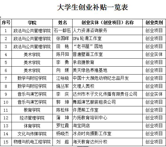 日前,我校组织申报的15个大学生创新创业项目,经省教育厅审核,省人社厅和省财政厅复核,全部获得省政府创新创业专项补贴,每项补贴1万元,学校成为四川省大学生创新创业重点培育单位。