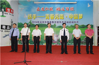 6月3日上午,由达州市禁毒委员会、达州市公安局与我校联合举办的“携手——青春无毒•中国梦”2014年达州市禁毒集中宣传月活动启动仪式在莲湖校区隆重举行。市委常委、市委政法委书记、市禁毒委主任古正举,副市长、市公安局局长、市禁毒委副主任徐承,学校党委书记李万斌、副校长张志远,市委宣传部副部长杨晓军、市公安局副局长文鹏飞等出席启动仪式。