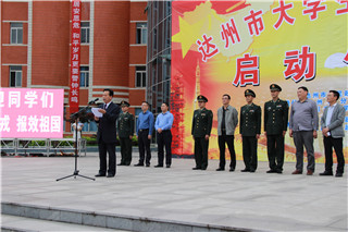 4月25日下午,由达州市人民政府、达州军分区及我校共同主办的2014年达州市大学生征兵工作启动仪式在我校莲湖校区音乐广场隆重举行。市委副书记郭亨孝,达州军分区司令员易继强,市委常委、军分区政委杨清华以及市民政局、市教育局、通川区委等相关单位领导出席启动仪式。学校党委书记李万斌出席启动仪式并讲话,仪式由副校长张志远主持。我校近2000名学生参加启动仪式。