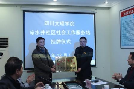 在达州市民政局牟道勇副局长、通川区凉水井社区陈传泽书记讲话后,由学校副校长王洪辉教授代表学校向凉水井社区陈传泽书记授予了“四川文理学院凉水井社区社工服务站”铭牌。