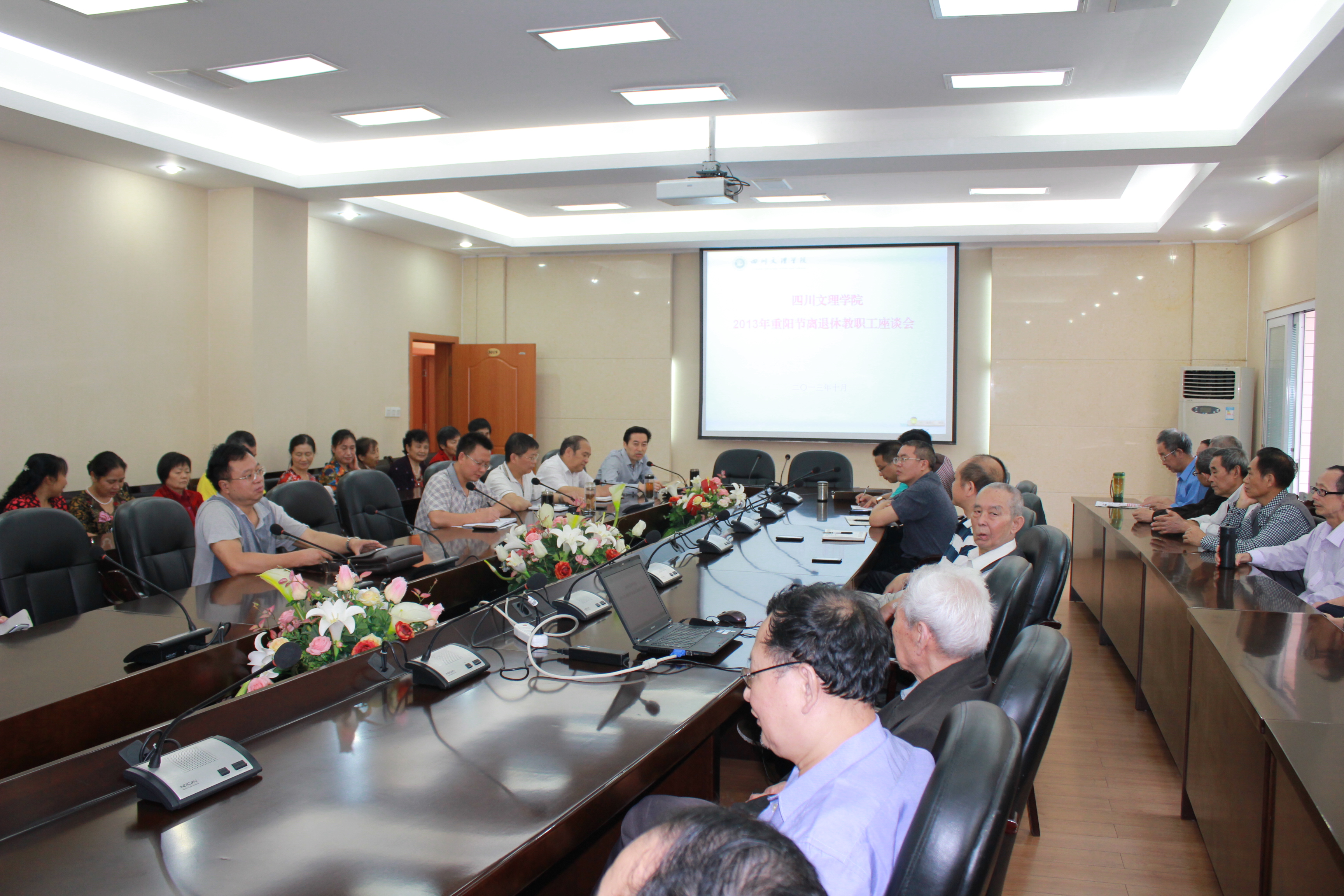 10月11日上午9时,离退休教职工2013年重阳节座谈会在新校区行政办公楼三楼会议室隆重举行。校长孟兆怀等在家校领导及相关职能部门主要负责人与60余名离退休教职工欢聚一堂,共庆节日。