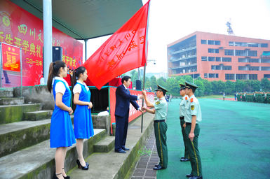 孟兆怀代表学校党委和行政向来自全国21个省(市、区)的近3000名新同学表示热烈的欢迎,向承担军训工作的武警达州市支队的首长和教官们表示衷心的感谢,并向军政训练团授旗。