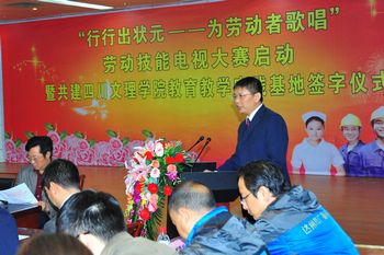 4月13日上午,达州市广电大厦四楼会议厅,鲜花怒放,伴随着欢快的迎宾曲,出席“行行出状元——为劳动者歌唱”劳动技能电视大赛启动暨共建四川文理学院教育教学实践基地签字仪式的嘉宾们愉快地交谈着。十一点整,在观看完一段达州广播电视台宣传片后,市广播电视台党委书记、台长陈明明女士发表了热情洋溢的欢迎词,出席会议的市级各有关单位代表相继发言,音乐系主任周先明、文传系主任范藻就我院文化艺术教育、新闻传播教育及实践活动支持地方经济文化建设作了发言。