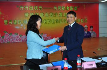 市委常委、市总工会主席陈中华到会讲话,充分肯定了此次活动的重要意义,并宣布大赛正式启动。在随后举行的共建四川文理学院教育教学实践基地签字仪式上,陈明明台长、王洪辉副院长代表双方共建合作协议书上签字。