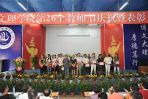 会上,副院长张志远宣读了《四川文理学院关于表彰2010年教书育人先进集体、优秀教师和优秀教育工作者的通知》,副院长王洪辉宣读了《关于表彰2009年科研工作先进集体和个人的通知》,教务处等9个先进集体和汪成慧等71名优秀教师获得表彰,大会还对在校工作满30年的教师和晋升为教授及获得博士学位的教师予以了表彰。