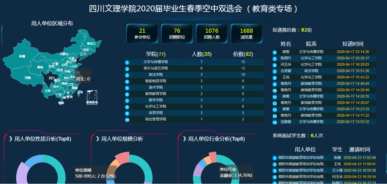 为进一步帮助毕业生顺利就业,学校专场举行了2020届毕业生春季空中双选会(教育类专场),来自北京、浙江、广东、重庆、成都等地的40余家教育类用人单位参与,提供岗位1076个,11个二级学院的毕业生投递简历。部分用人单位通过QQ、微信、腾讯会议等方式对我校毕业生开展了线上面试工作,效果良好。