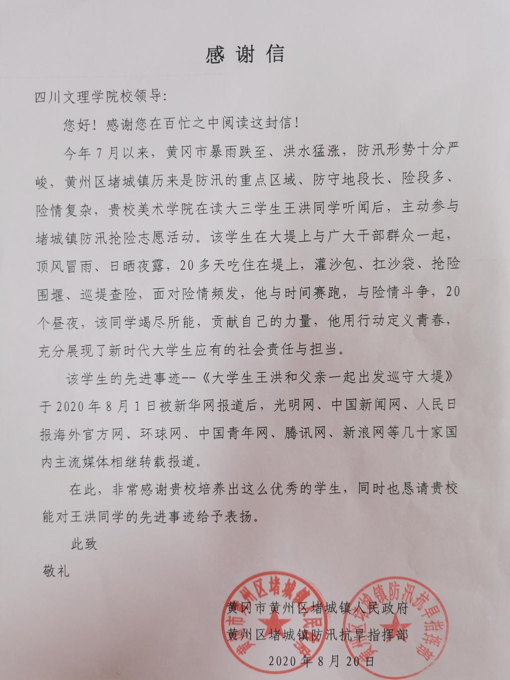 9月26日上午,黄冈市黄州区堵城镇人民政府、黄州区堵城镇防汛抗洪抗旱指挥部向学校寄来感谢信,对我校美术学院大三学生王洪同学在家乡踊跃参与抗洪抢险,勇于担当奉献,面对灾情冲锋在前的积极表现予以感谢与称赞。