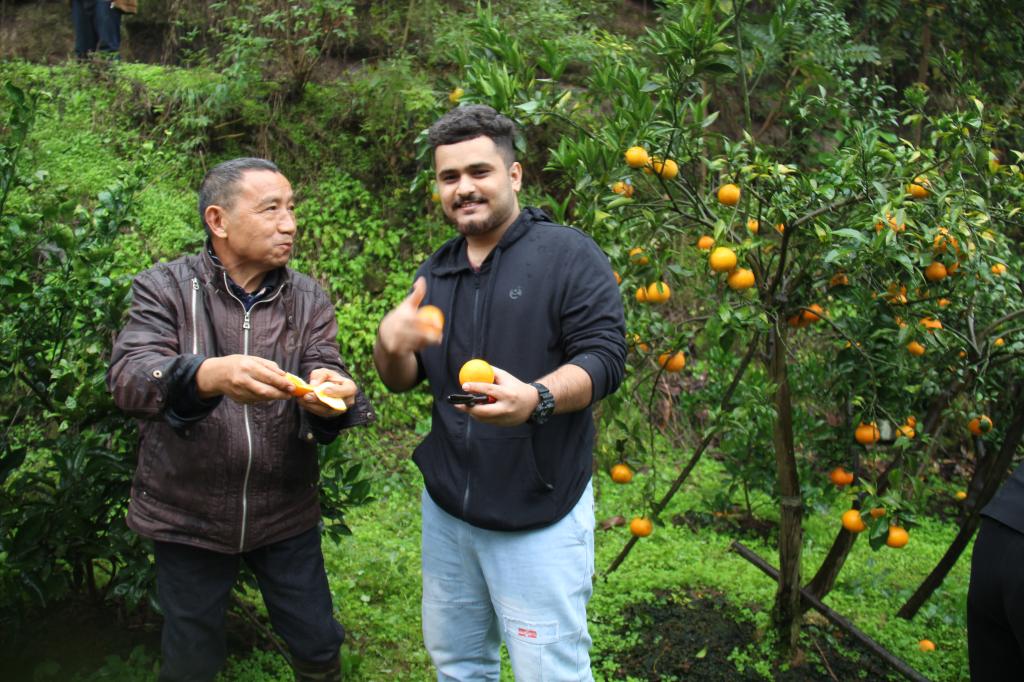 留学生李安一边吃橘子一边说:“这里的橘子真的好吃!这么大橘园,令我很吃惊!中国农村把农业和旅游业结合起来,很值得学习!”“中国的城市和农村都很美丽!如果有机会我要回家带我的家人一起来中国。”留学生卡林这样说。