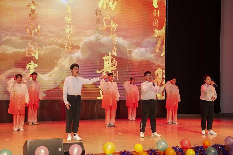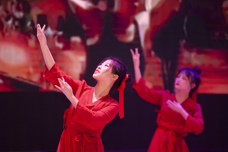 晚会在大学生通讯社网运部及制造街舞社带来的热情四溢的舞蹈串烧中拉开帷幕。合唱《少年中国说》《只要平凡》中,演员们用真诚而饱含情感的歌声唱响了对英雄的赞美,唱响了青年学生传承红色基因的爱党情怀。舞蹈《云与海》《灯火里的中国》中,演员们的舞蹈动作精准而优美,表达了对祖国的热爱和赞美。朗诵《我的“自白书”》《党旗飘飘》《向胜利进军》《我爱你中国》中,演员们情感真挚饱满,语言铿锵有力,表达了青年学子对党和祖国的炽热之情。《战地惊雷》以小品的形式让观众看到了革命先烈为新中国的成立所做出的牺牲,对青年学生来说是一堂生动的爱国教育课。党史知识问答、听歌识曲等互动环节,调动了观众学习党史的热情,将整个晚会推向高潮。最后,晚会在全体演职人员合唱的《在灿烂阳光下》圆满落幕。
