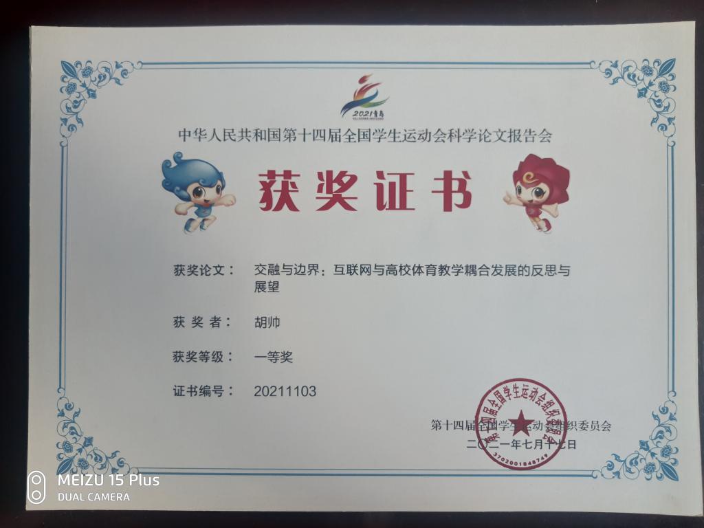7月15至17日,由教育部、国家体育总局、共青团中央联合主办的“中华人民共和国第十四届全国学生运动会科学论文报告会”在山东青岛举行。在此次报告会上,我校教师胡帅提交的论文《交融与边界:互联网与高校体育教学耦合发展的反思与展望》荣获一等奖,并在报告会上作交流发言。邓闿林老师提交的论文荣获二等奖,副校长徐晓宗提交的论文荣获三等奖。