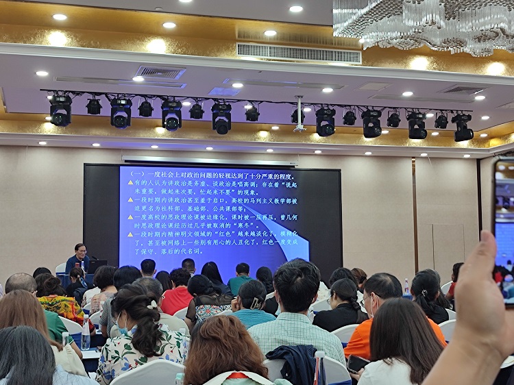 全国模范教师朱月龙教授作“思政课教学与红色传承教育”专题报告。朱月龙教授从当前意识形态领域存在的问题为切入点,强调重视思想政治教育和传承好红色基因必要性。分析了红色基因与思政课之间的紧密联系,提出思政课传承红色基因教育必须务求实效,强调赓续红色基因是思政课贯穿始终的主线。提议思政课教师要通过运用革命斗争的旧址、革命先烈、中国共产党人的艰难斗争场景、革命文化、革命先辈优良传统和精神瑰宝的谱系、开国领袖的丰功伟绩和伟人风采等主要因素在思政课中传承好红色基因。特别是讲到思政课传承红色基因教育必须务求实效,讲到红色资源与思政课程内容如何做到有机契合、自然融合,有效融合。红色资源与课程思政结合中如何做好课堂气氛的营造、教学语言的运用、微观知识点的掌握。朱教授将他四十年深耕思政一线教学的实践经验和盘托出,字字珠玑、句句干货。老师们为朱教授的报告所震撼,表示重新认识到作为思政课教师的无上光荣和伟大使命,一定要在日后的思政课教学中将朱老的经验活学活用、落地落实。