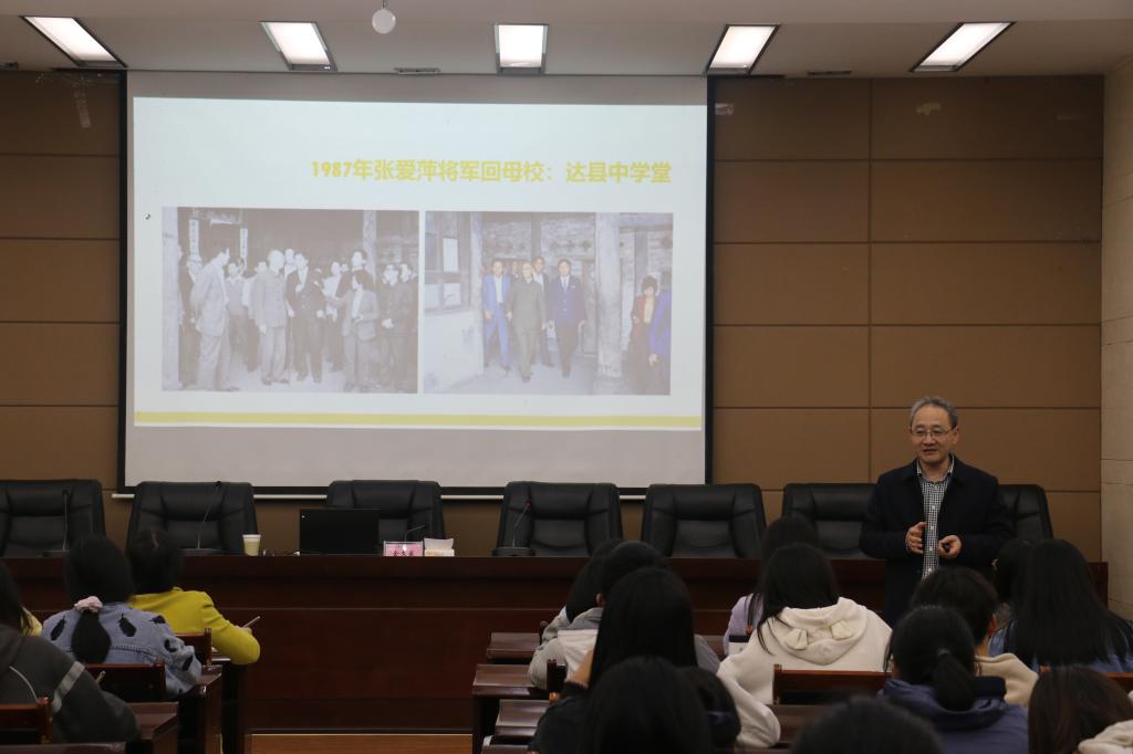 余文盛教授主要从办学缘起、“五老先生”、扩校升本、国际交流等8个方面讲述学校的前世今生。他对学校历史如数家珍,讲故事和配图片的授课方式生动鲜活,把宣讲员带入到学校发展各阶段的情境中。同学们感受到张爱萍将军对学校发展的关心,张爱萍将军从我校南坝校区踏上革命征途,1987年回到母校视察并挥毫为学校即将修建的图书大楼题写馆名;也知道了“德艺双馨”的章继肃、“四川省劳动模范”王膏若、捐赠毕生藏书给学校的尹祖健等老先生,并被他们的渊博学识、敬业精神和朴素作风深深打动。余文盛教授说,在学校从师范专科到综合性本科院校的发展历程中,凝聚着历代师生奋发有为的智慧和攻坚克难的奉献精神。