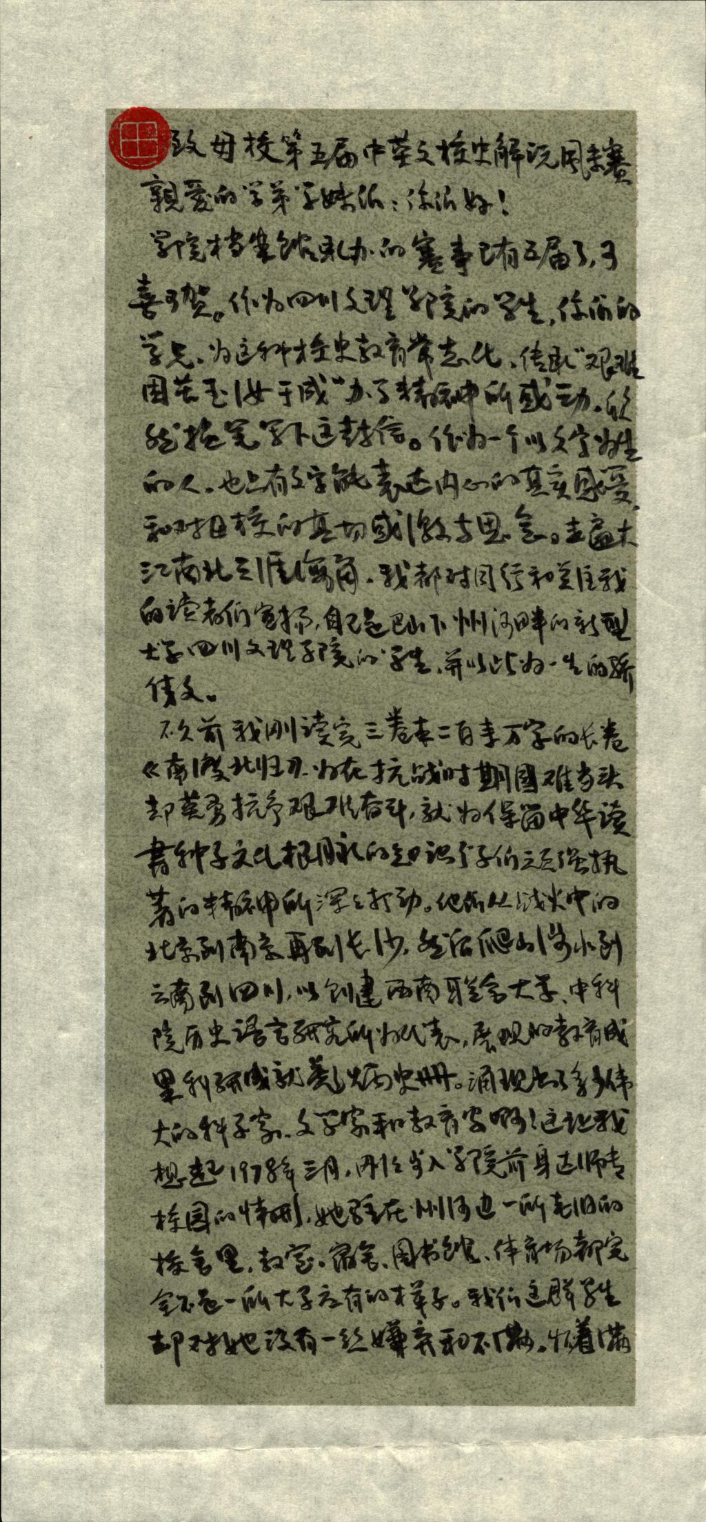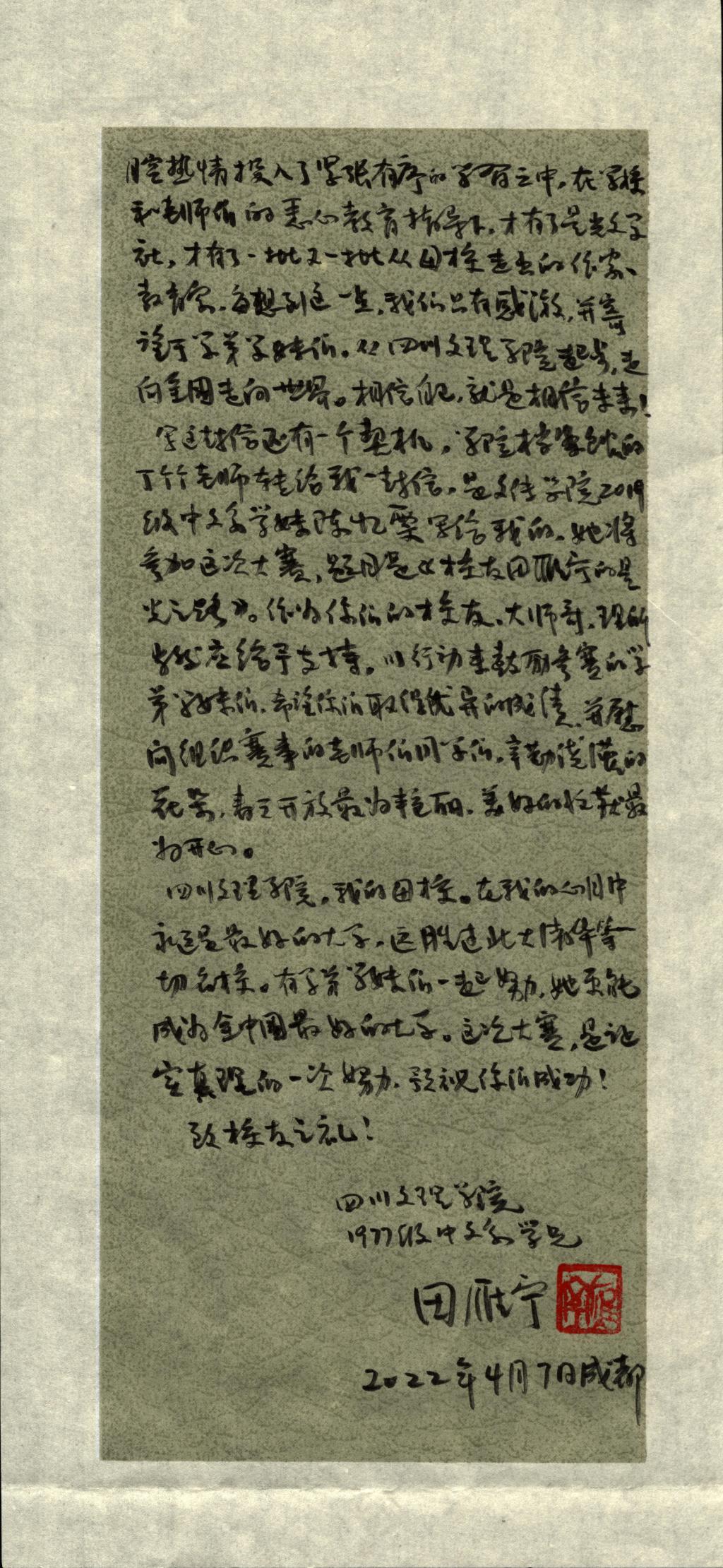 近日,档案馆收到田雁宁的来信,来信中这样写道:致母校第五届中英文校史解说风采赛的学弟学妹们:你们好!作为文理学院的学生,你们的学兄,为这个校史教育常态化,传承“艰难困苦玉汝于成”办学精神所感动,欣然提笔写下这封信。作为一个以文字为生的人,也只有文字能表达内心的真实感受和对母校的真切感激与思念。走遍大江南北天涯海角,我都对同行和关注我的读者们宣扬,自己是巴山下州河畔的新型大学四川文理学院的学生,并以此为一生的骄傲。