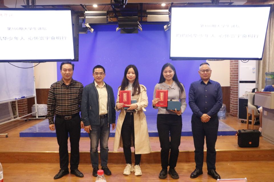 近日,外国语学院第100期大学生讲坛在莲湖校区情景实验室顺利举办。2017届毕业生刘芳维和2021届毕业生赵芡应邀担任主讲人,外国语学院党总支书记王义文讲话、体育学院党总支书记王兆忠致辞。