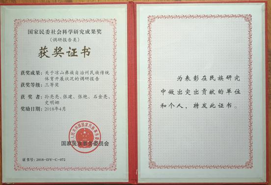 近日,国家民委2017年度全国民族工作优秀调研报告评选结果揭晓。我校体育学院孙亮亮副教授带领研究团队完成的《关于凉山彝族自治州民族传统体育开展状况的调研报告》,荣获国家民委社会科学研究成果奖(调研报告类)三等奖。