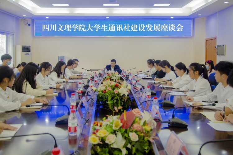 10月21日,党委副书记侯忠明教授调研大学生通讯社建设发展工作,并召开座谈会。党委宣传部梁英豪、魏晓军,指导老师陈晓霞及大学生通讯社全体学生干部参加座谈会。