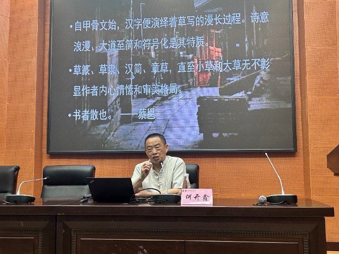 为促进学术交流,拓展专业视野,5月4日,我校特邀中国书法协会草书委员会委员、十二届国展评委、四川省书协行草书委会主任何开鑫教授来校,为书法学专业师生作题为“草书特质及多元构成”的学术报告,中华传统文化学院院长王赠怡主持报告会。
