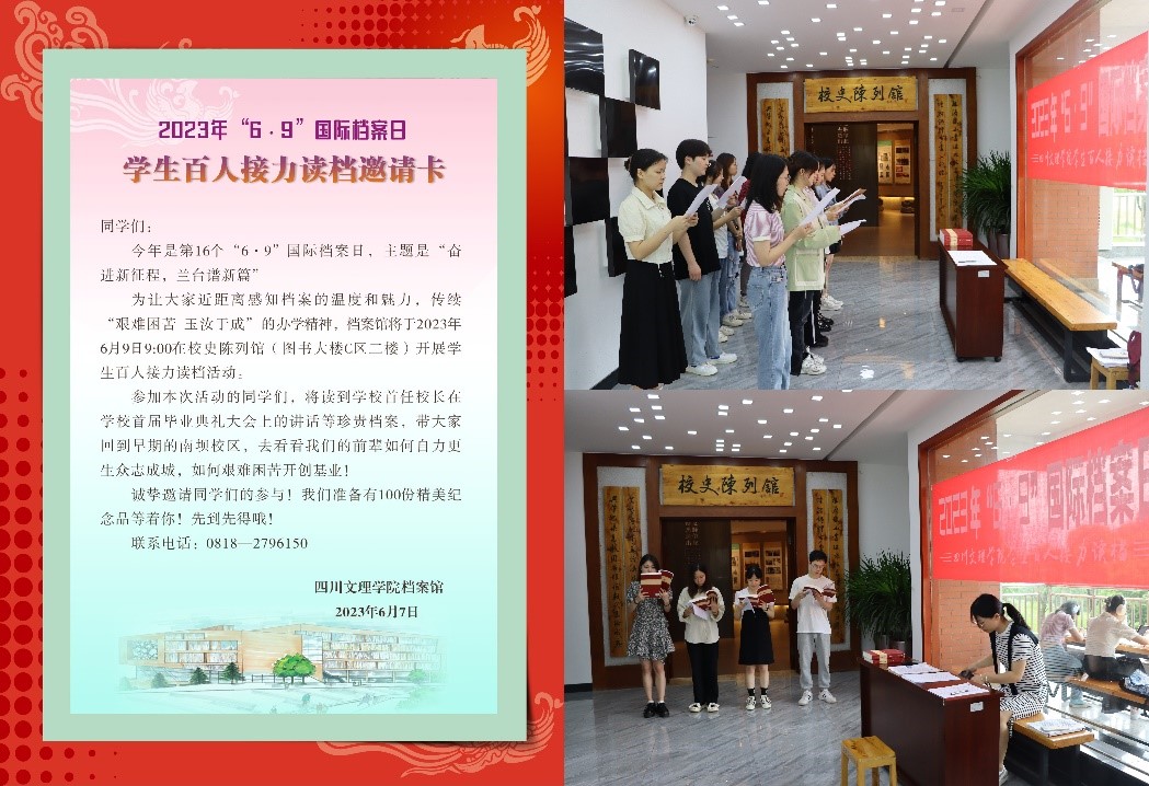 “奋进新征程 ,兰台谱新篇”。 在第16个“6·9”国际档案日集中宣传周期间,档案馆面向师生推出教职工线上档案知识竞答、学生百人接力读档、档案开放日、推送毕业生档案服务卡等有意义、有温度、有感染力的系列活动,让档案走近师生,让师生走进档案馆,在档案服务师生的真实体验中营造档案工作良好氛围。
