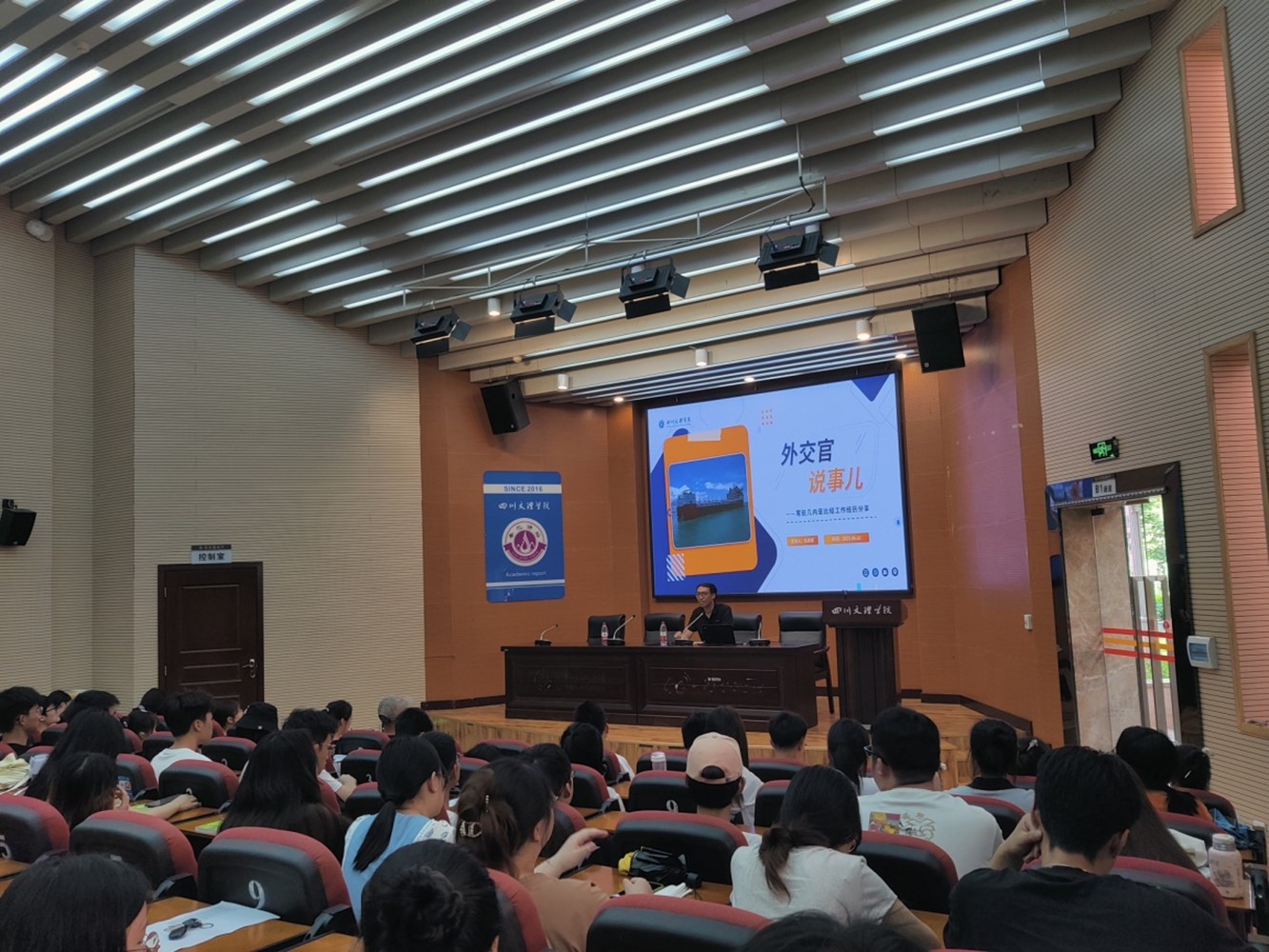 为进一步加强大学生思想政治教育,引导大学生厚植爱国情怀,珍惜当下,热爱生活。6月12日,中华传统文化学院邀请学校计财处综合科科长孔祥忠作题为《外交官说事儿》的大学生思想政治教育主题讲座。党委副书记秦静主持,团总支书记尹超、辅导员冯华和全院学生到场聆听。