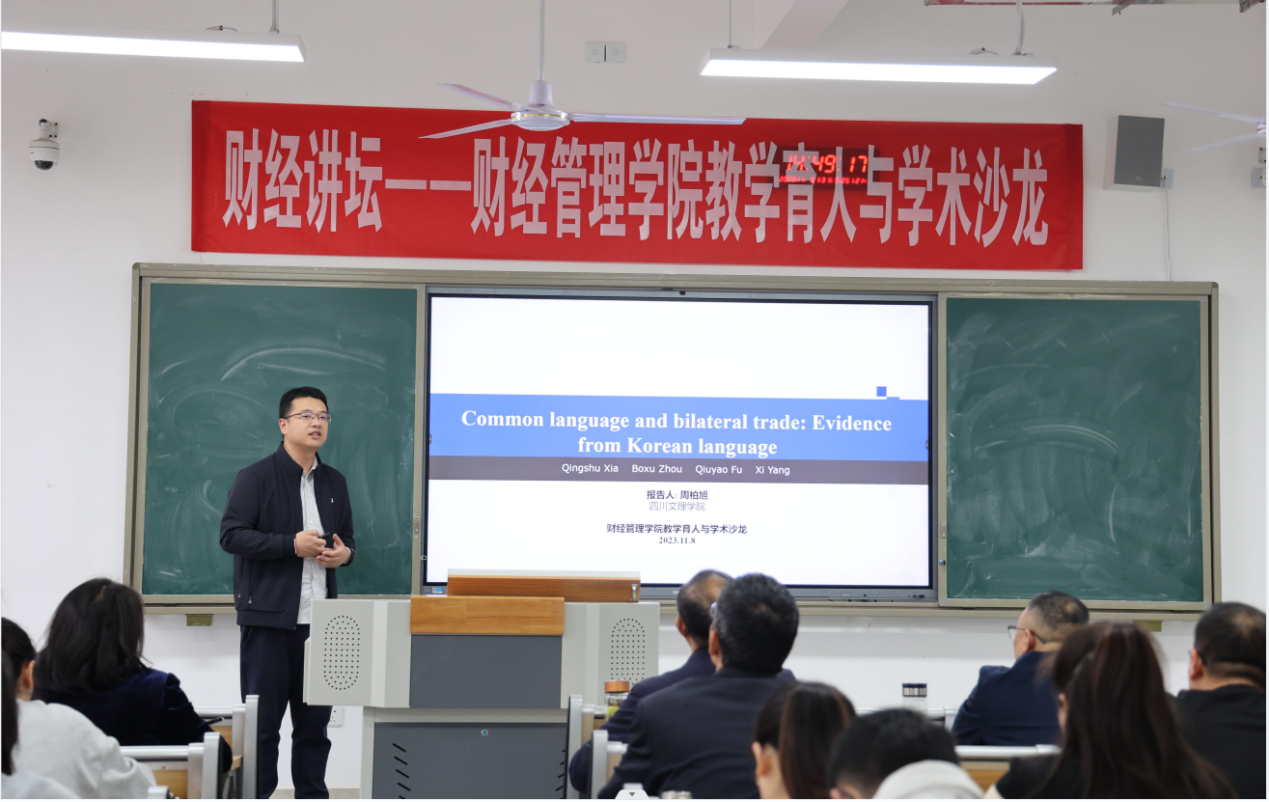 11月8日,财经管理学院举办“财经讲坛—财经管理学院教学育人与学术沙龙”活动。周柏旭博士应邀作“Common language and bilateral trade: Evidence from Korean language”专题讲座。党委书记刘天、院长傅忠贤讲话,80余名师生代表参加活动。