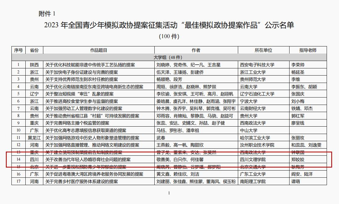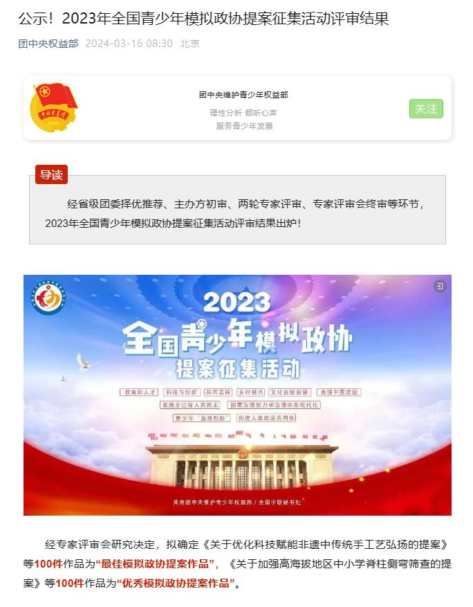 近日,团中央权益部公示了2023年全国青少年模拟政协提案征集活动评审结果,由我校敬善美、白只作、何佳馨同学组队申报,郑姣姣老师指导撰写的《关于改善当代年轻人恐婚恐育社会问题的提案》荣获2023年全国青少年模拟政协提案征集活动“最佳模拟政协提案作品”。