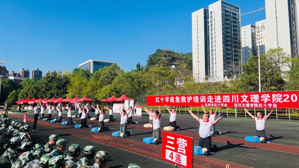 为进一步全面加强学校急救教育,保护青年大学生生命健康,培养大学生乐于施救、敢于施救、善于施救的意识和能力,10月8日至17日,学校在莲湖、南坝两个校区集中开展“2024年新生军训急救培训”活动,共计4900余名新生参加。本次培训由后勤服务处、学生工作部、达州市红十字会共同主办,四川文理学院大学生红十字志愿服务协会承办。