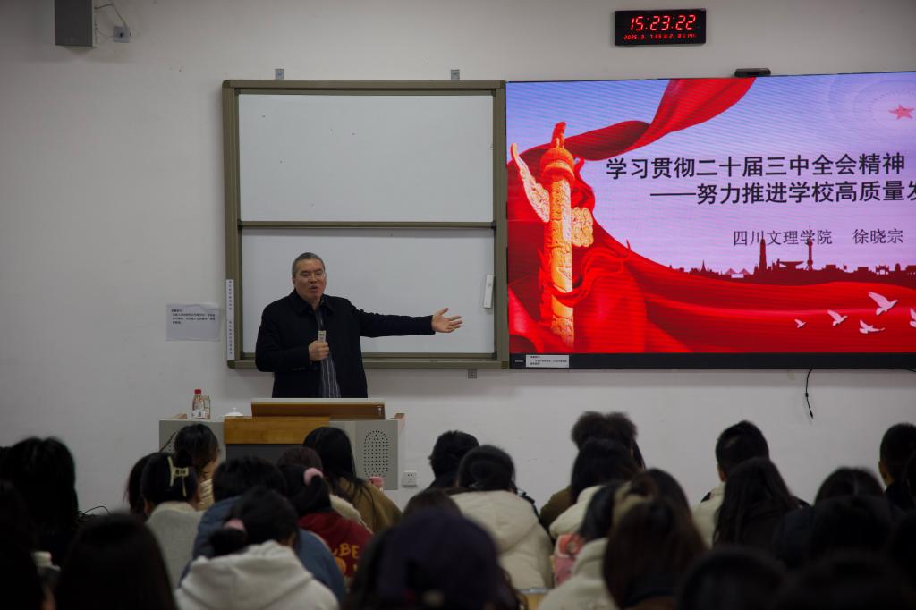 3月7日,党委副书记徐晓宗以“学习贯彻党的二十届三中全会精神——努力推进学校高质量发展”为主题,为财经管理学院师生讲授思政课。