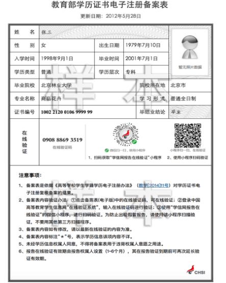 (《教育部学历证书电子注册备案表》示例)