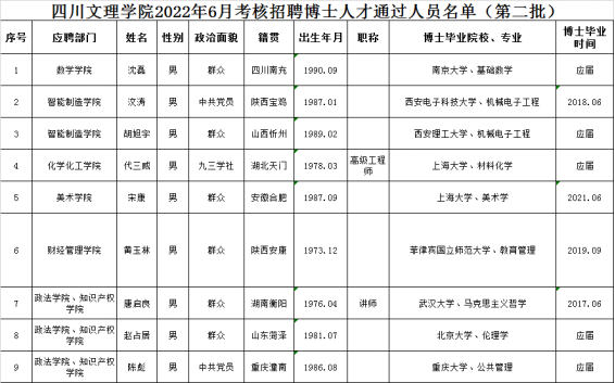 按照《四川文理学院2022年博士人才招聘公告》,经过初试(初审)、复试考核程序,现将四川文理学院2022年6月考核招聘博士人才通过人员名单(第二批)予以公布,请报考者注意查阅。