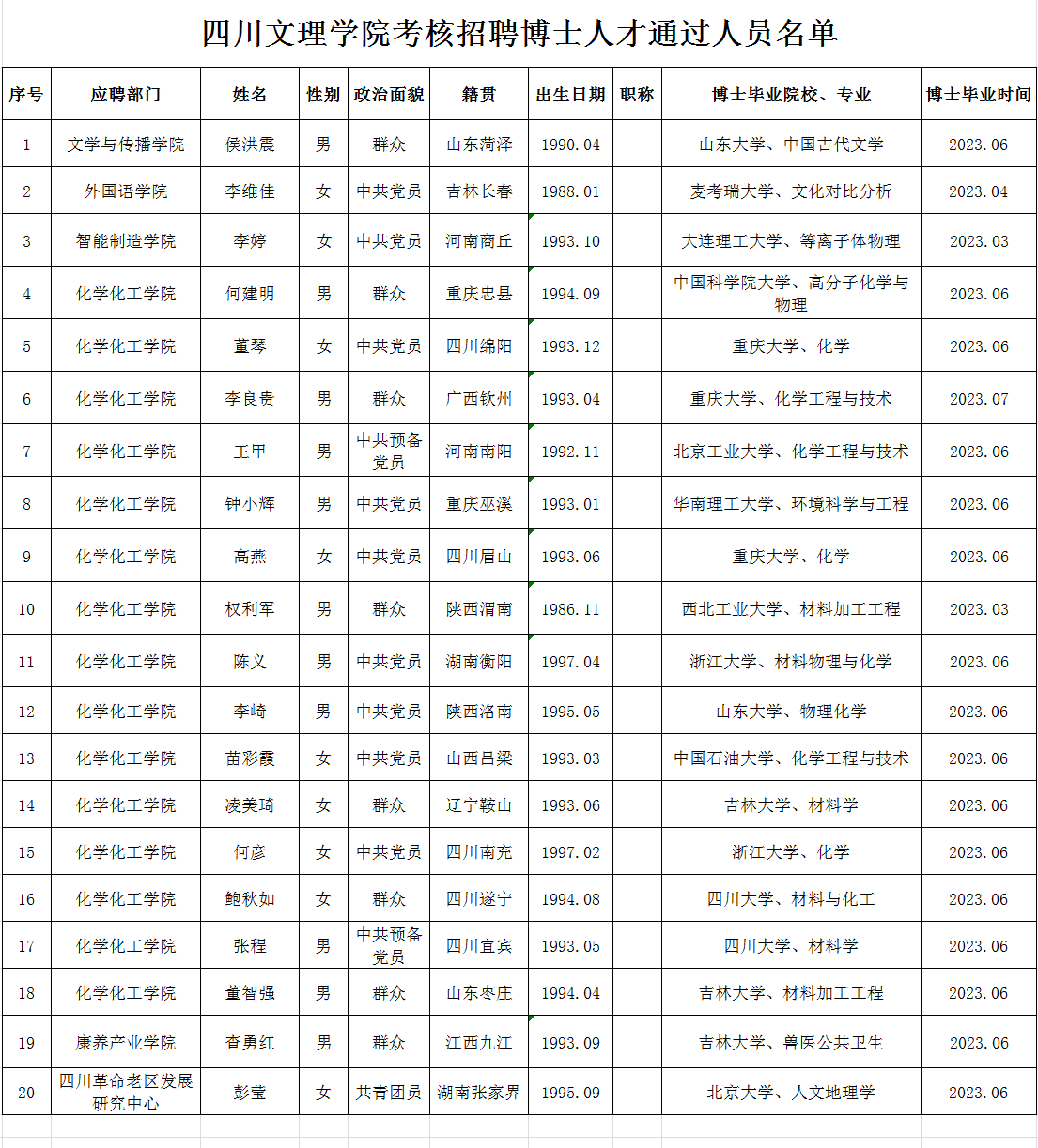 按照《四川文理学院高层次人才引进与管理办法》(川文理委〔2019〕84号),经过初试(初审)、复试考核程序,现将四川文理学院考核招聘2023年博士人才通过人员名单予以公布,请报考者注意查阅。