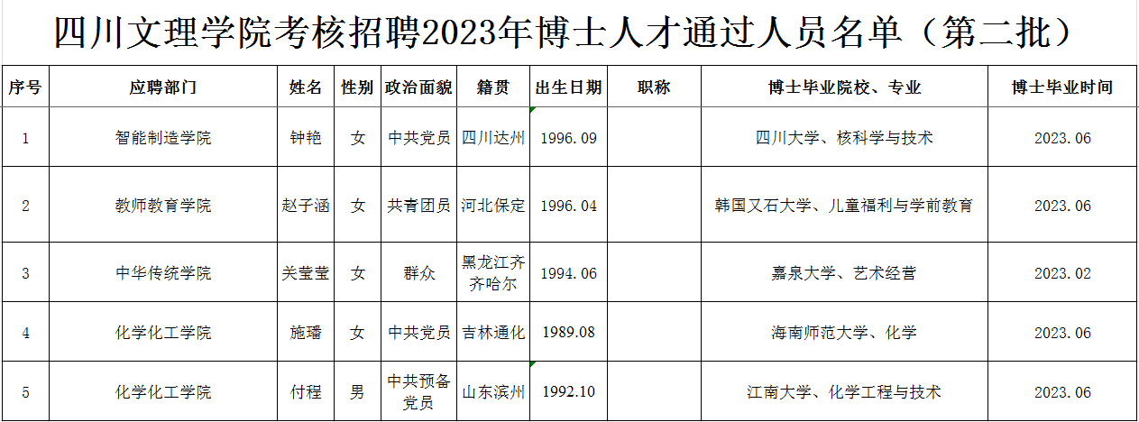 按照《四川文理学院高层次人才引进与管理办法》(川文理委〔2019〕84号),经过初试(初审)、复试考核程序,现将四川文理学院考核招聘2023年博士人才通过人员名单(第二批)予以公布,请报考者注意查阅。
