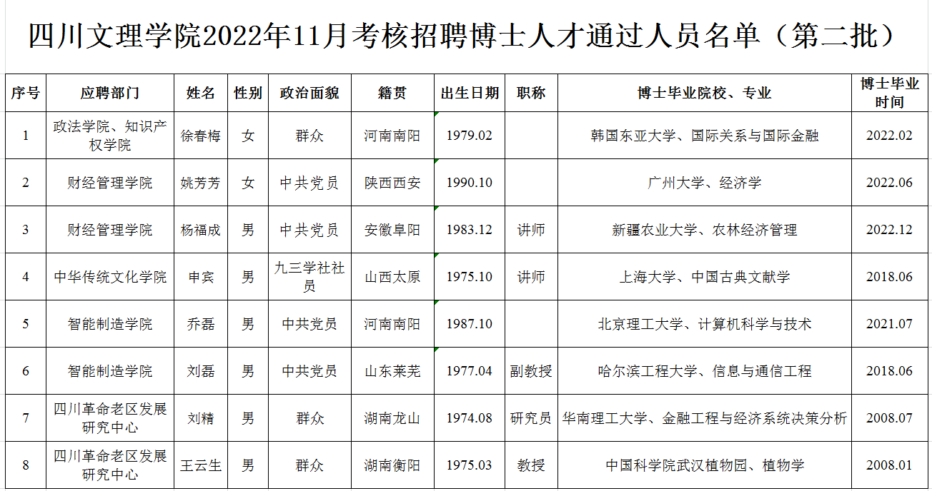 按照《四川文理学院2022年博士人才招聘公告》,经过初试(初审)、复试考核程序,现将四川文理学院2022年11月考核招聘博士人才通过人员名单(第二批)予以公布,请报考者注意查阅。