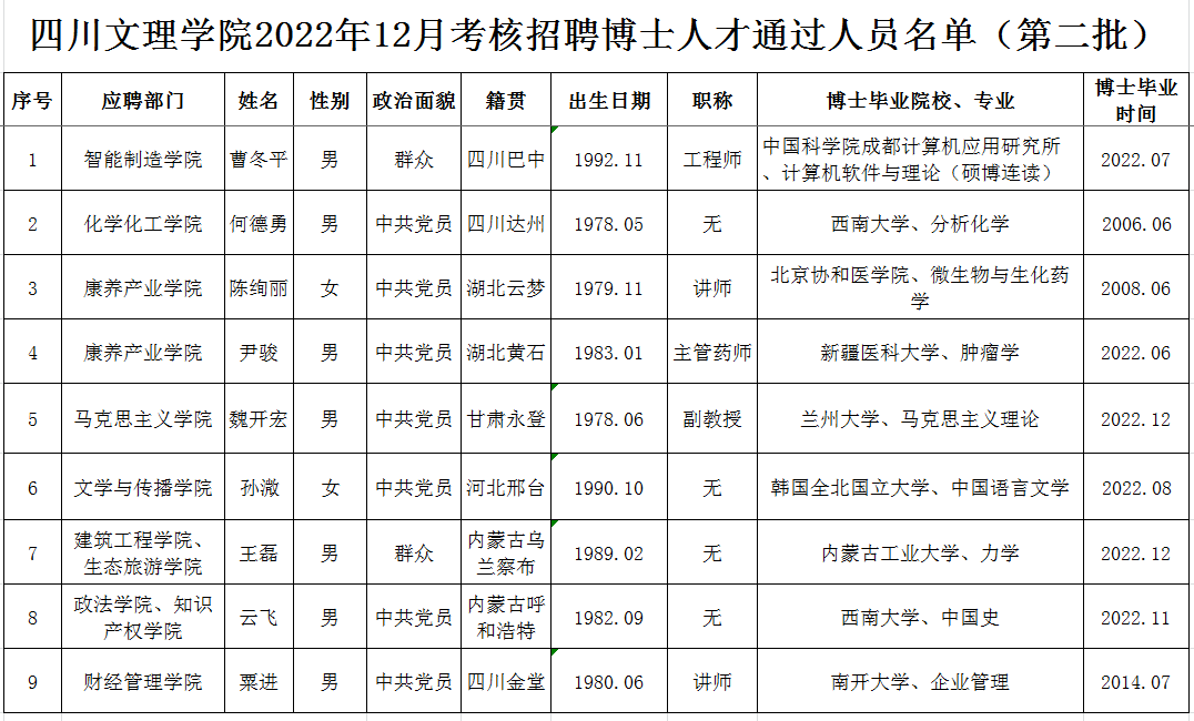 按照《四川文理学院2022年博士人才招聘公告》,经过初试(初审)、复试考核程序,现将四川文理学院2022年12月考核招聘博士人才通过人员名单(第二批)予以公布,请报考者注意查阅。