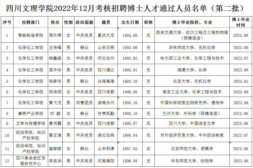 按照《四川文理学院2023年博士人才招聘公告》,经过初试(初审)、复试考核程序,现将四川文理学院2022年12月考核招聘博士人才通过人员名单(第二批)予以公布,请报考者注意查阅。