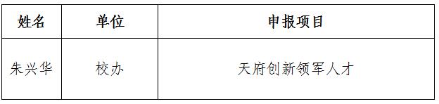 根据省人才办《关于开展2019年“天府万人计划”申报工作的通知》、省科学技术厅《关于做好2019年“天府万人计划”天府创新领军人才等3个项目推荐工作的通知》文件精神,经个人申报、人事处审核、学校同意,推荐朱兴华同志申报“天府万人计划”天府创新领军人才项目。