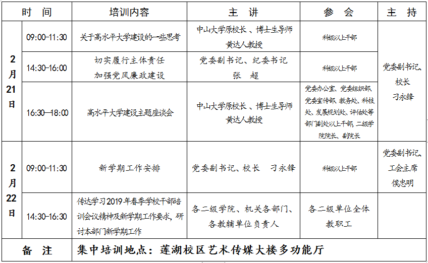 为全面落实中央、省委有关干部教育培训精神,认真贯彻学校第一次党代会精神,进一步提升我校干部队伍政治业务素养,根据学校2019年党政工作安排,现将2019年春季干部培训有关事项通知如下: