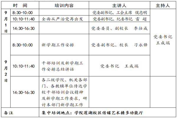 为全面落实中央、省委有关干部教育培训精神,进一步提高我院干部队伍的综合素质,根据学院党委年度工作安排,结合学院工作实际和干部队伍建设要求,现将2018年秋季干部培训的有关事项通知如下: