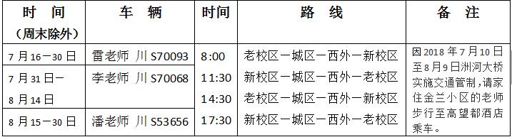全校师生: 根据学校工作安排,2018年暑假放假时间为7月14日(星期六)。8月31日教职工报到。为方便假期上班的教职工,后勤服务处安排车辆进行了值班(详见下表),请相互转告!