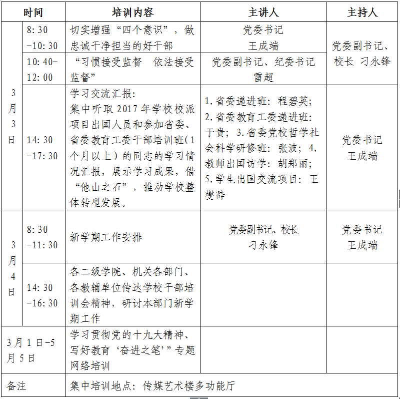 本次培训,以“不忘初心、牢记使命”为主题,深入学习习近平新时代中国特色社会主义思想和党的十九大精神,增强党性,践行“四有”(心中有党、心中有民、心中有责、心中有戒),加强和改进学校思想政治工作,提高干部履职能力。通过培训,进一步使参训干部坚定理想信念,增强做好学校思想政治工作的政治自觉和思想自觉;进一步使参训干部了解中央、省委的战略规划和决策部署以及高等教育的发展态势,增强做好本职工作的行动自觉。