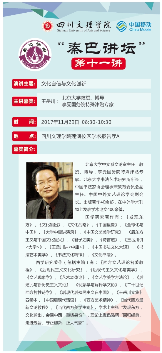秦巴讲坛第十一讲预告:王岳川主讲文化自信与文化创新