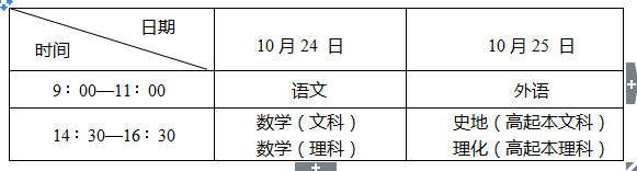 二、考试时间 (一)、高中起点升本、专科考试时间表 (二)、专科起点升本科考试时间表