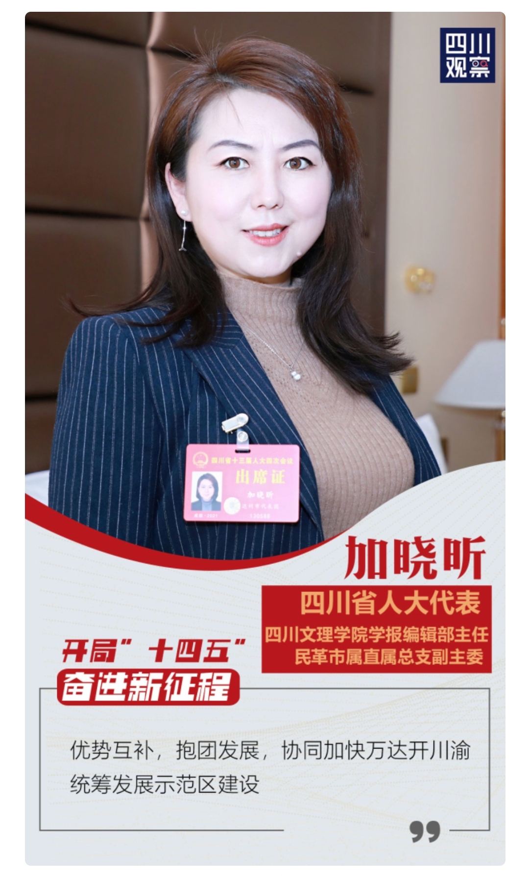 1月30日上午,四川省第十三届人民代表大会第四次会议在成都开幕。来自全省各地、各条战线的省人大代表齐聚一堂,依法履行宪法法律赋予的神圣职责,共商全面建设社会主义现代化四川大计。会议期间,四川省人大代表、我校学报编辑部主任、民革市属直属总支副主委加晓昕教授接受了《四川观察》的采访,在提交的《关于支持建设“大巴山·大三峡”旅游环线的建议》中,深刻论证了协同创建万达开川渝统筹发展示范区,优势互补,抱团发展的理念。建议省委政府要加强资金、项目、土地等方面的支持力度,加快川渝城市一体化发展,省政府及省旅游局、省交通运输厅等省级有关部门支持达州推进“大巴山·大三峡”文化旅游环线建设,将相关重点项目纳入全省交通发展规划,并重点支持巴山大峡谷创5A级景区工作和八台山-龙潭河-巴山大峡谷旅游通道建设。