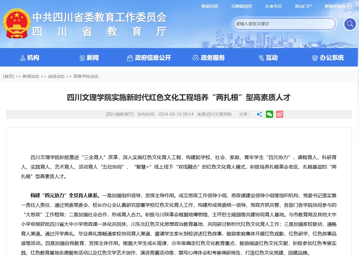 四川文理学院积极推进“三全育人”改革,深入实施红色文化育人工程,构建起学校、社会、家庭、青年学生“四元协力”,课程育人、科研育人、实践育人、艺术育人、活动育人“五位协同”,“智慧+”线上线下“双线融合”的红色文化育人模式,积极培养扎根革命老区、扎根基层的“两扎根”型高素质人才。